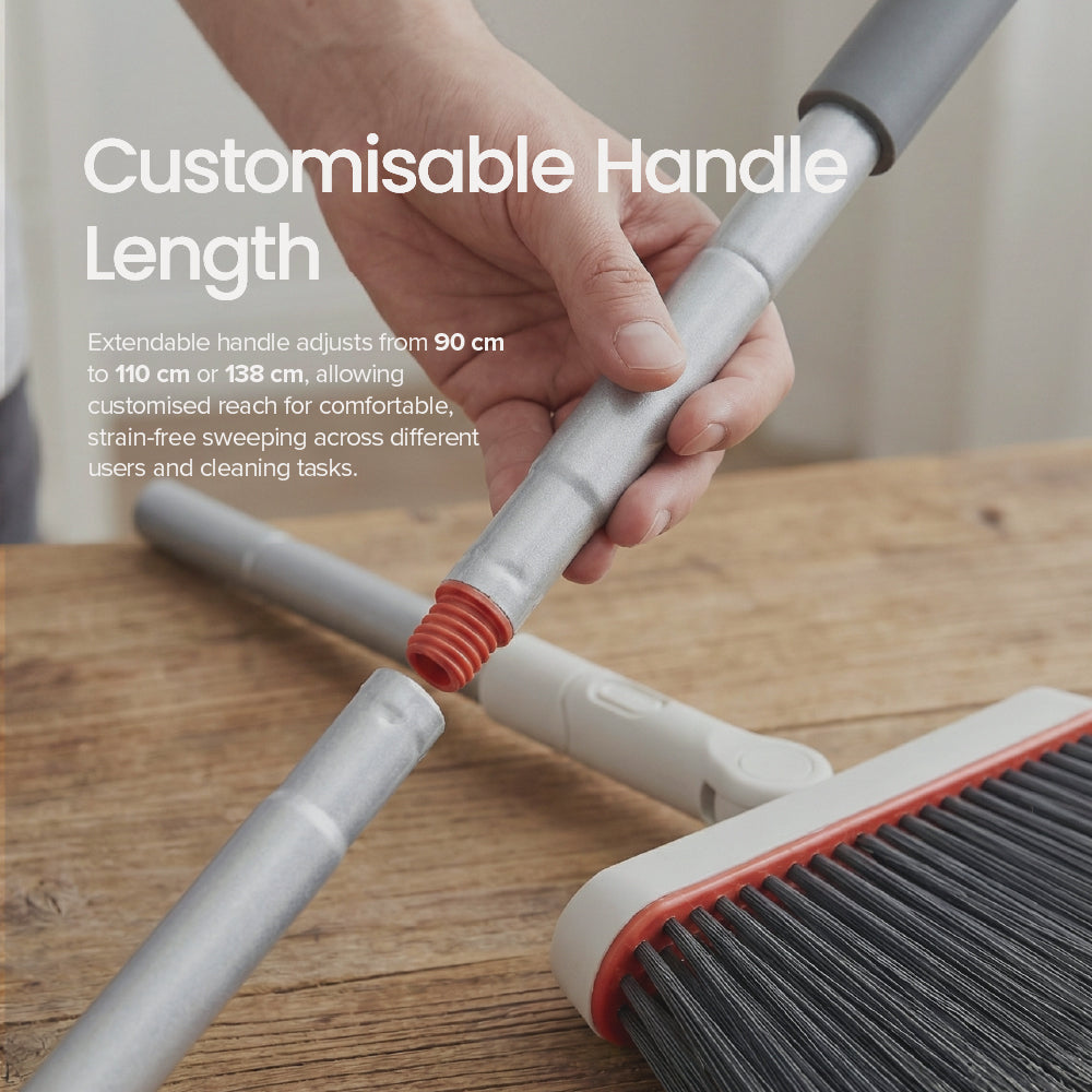 White Magic Dustpan Set includes interchangeable indoor and outdoor broom heads, allowing you to switch easily between surfaces and cleaning tasks. The indoor head features finer, softer bristles designed to sweep dust, crumbs, and pet hair gently from hard floors without scratching. The outdoor head uses firmer bristles to handle tougher debris such as dirt, leaves, and grit on patios, garages, balconies, and entryways. This flexible design eliminates the need for multiple brooms, giving you one practical cleaning solution for both indoor and outdoor areas.